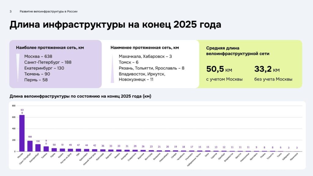На конец 2025 года разрыв между городами по длине велодорожек остается огромным. Москва — безусловный лидер с 638 км велоинфраструктуры. Дальше идут Санкт-Петербург (188 км) и Екатеринбург (130 км).