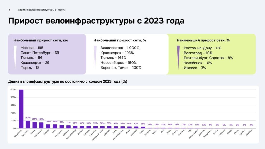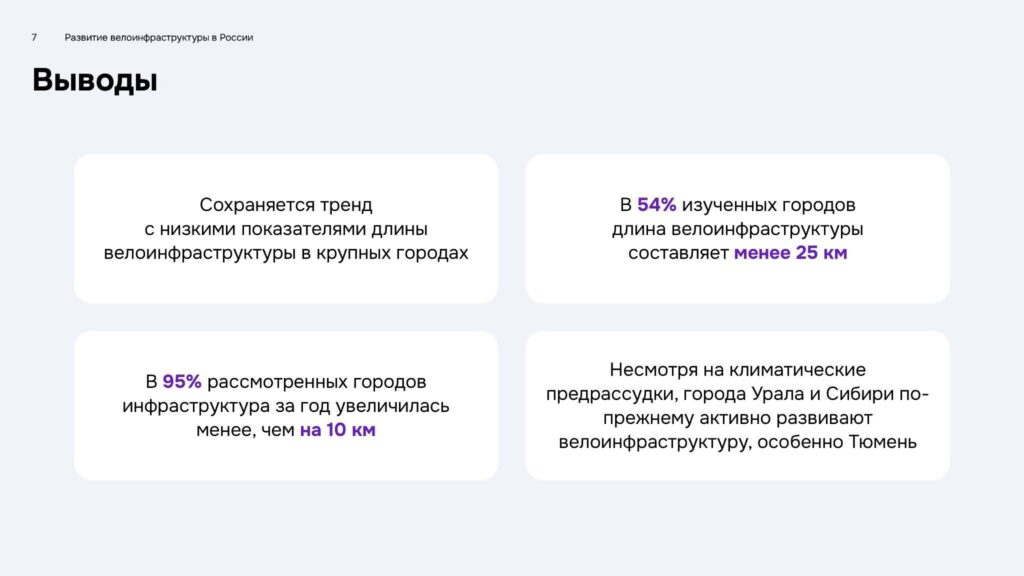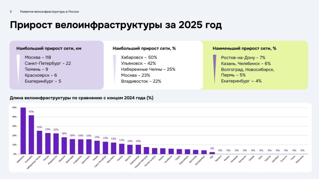 Согласно результатам исследования, сохраняется тенденция к низкой протяженности велоинфраструктуры в крупных городах: в 54% изученных городов общая длина велодорожек составляет менее 25 км, а в 95% городов прирост сети за год оказался менее 10 км.