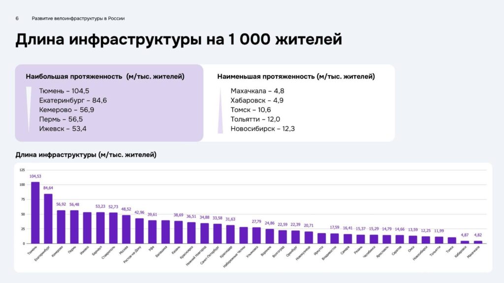 Если считать не просто общую длину велодорожек, а сколько их приходится на жителей, картина становится более показательной. В этом разрезе лидирует Тюмень — 104,5 метра велодорожек на тысячу жителей. Далее идут Екатеринбург (84,6), Кемерово (56,9), Пермь (56,5) и Ижевск (53,4). Внизу списка — Новосибирск (12,3), Тольятти (12), Томск (10,6), Хабаровск (4,9) и Махачкала (4,8).