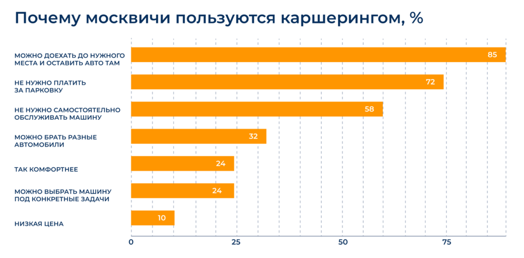 Каршеринг выбирают прежде всего из-за удобства. На нём можно доехать до нужного места и оставить машину там, где это удобно, не думая о парковке и обслуживании. Важна и гибкость: сервис подходит для разных сценариев поездок — от разовых выездов до подмены личного авто.