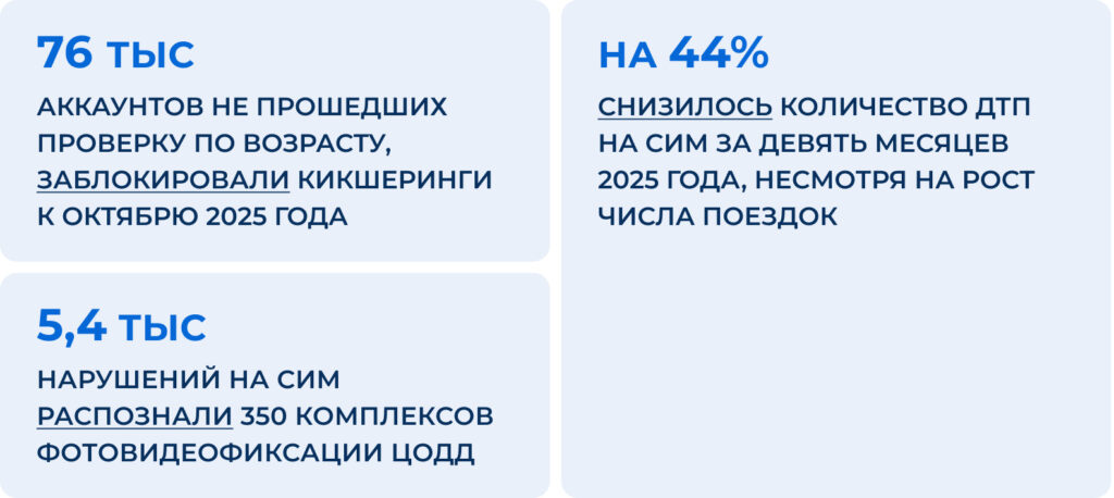 Модель с обязательной идентификацией позволила сократить доступ несовершеннолетних и пользователей с поддельными аккаунтами, а также упростила поиск виновников нарушений и ДТП. Благодаря этим мерам снизилось количество аварий на СИМ и пострадавших в них.