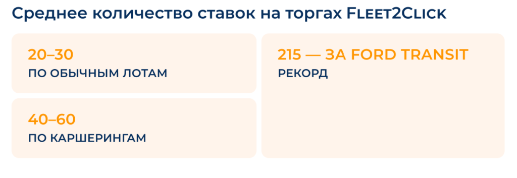 Так, на автомобильных торгах представлены самые разные машины, от частных автомобилей до транспорта из коммерческих парков. В среднем за один лот участники делают 20–30 ставок. Машины из каршеринга вызывают больший интерес: по ним обычно набирается 40–60 ставок, а в отдельных случаях — значительно больше. Однажды за один Ford Transit участники торгов сделали 215 ставок.