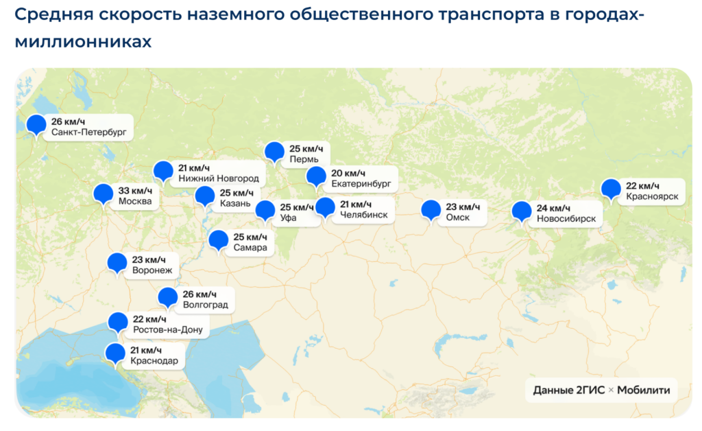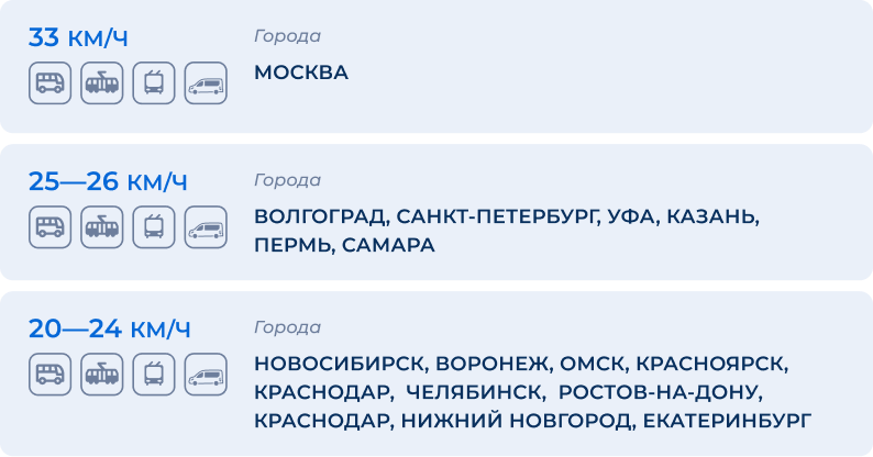 По данным исследования журнала Мобилити на основе данных сервиса 2ГИС, наземный городской транспорт в крупнейших городах России двигается со средней скоростью всего 20–26 км/ч. Такая скорость складывается с учетом остановок и дорожно-транспортной обстановки.