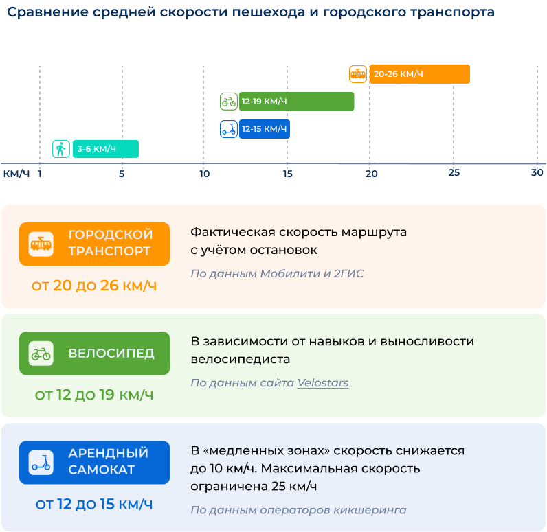 Получается, что городской транспорт с учётом всех остановок, пробок и пересадок едет довольно медленно. Его реальная скорость оказывается сопоставимой с микромобильным транспортом — самокатами и велосипедами, которые при этом дают больше гибкости и позволяют ехать без задержек.