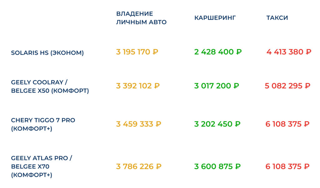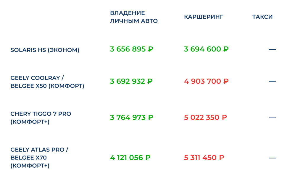Интересный факт: чем дешевле личная машина, тем дороже её содержать на фоне каршеринга и такси категории «эконом». Так, у Solaris HS расходы выше из-за фиксированных платежей — кредита, страховки, налогов и амортизации. В «экономе» это даёт почти миллион переплаты по сравнению с каршерингом. А вот Geely Coolray / Belgee X50 и у других машин разрыв меньше: тарифы аренды в «комфорте» сами по себе дороже, поэтому при больших пробегах владение сравнивается с арендой или становится дешевле её.
