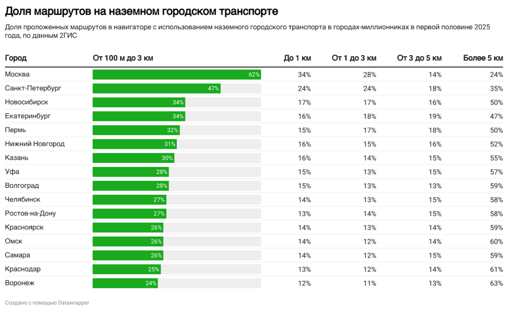 Самая высокая доля коротких маршрутов на наземном городском транспорте — в Москве (62%), Санкт-Петербурге (47%) и Новосибирске (34%).
