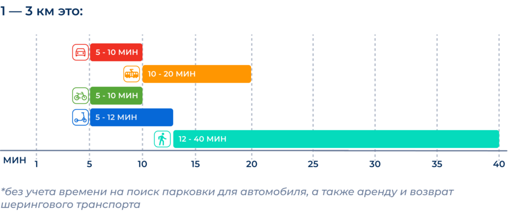 5. На автомобиле (без учета времени на парковку), электросамокате и велосипеде поездки на расстояние от 0 до 3 км будут быстрее (5—12 мин.), чем на наземном городском транспорте (10—20 мин.)