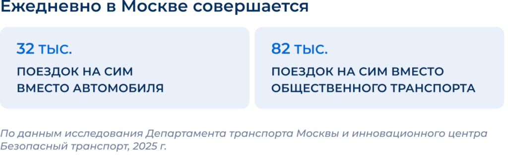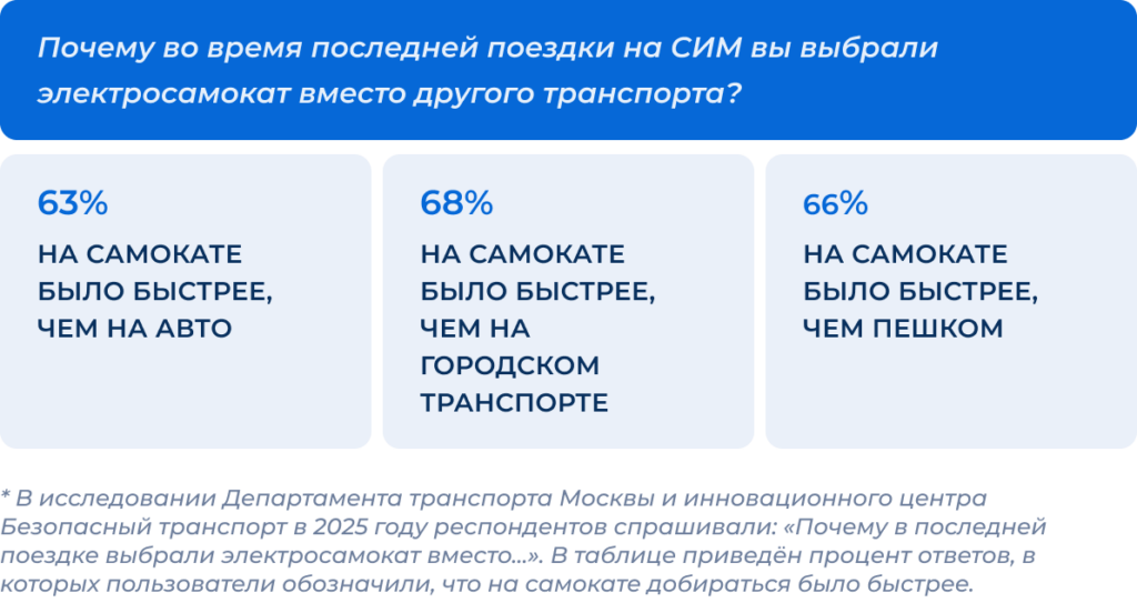 Так, например, по данным опроса Департамента транспорта Москвы, во время последней поездки на СИМ респонденты выбрали электросамокат вместо другого транспорта, потому что добираться на нем было быстрее.